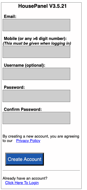 A valid email, phone, username, and password must be provided. The mobile number can actually be any sequence of 6 or more numerical digits that you must remember when logging in; however, if you provide a real mobile number HousePanel can txt you password reset information. HousePanel has the option to be configured to require new accounts to be confirmed using an email authorization. To set this up you must provide an SMTP email configuration information in the housepanel.cfg file. By default new users do not require confirmation. If you have set up a SMTP email server then you can also use the “reset password” feature to deal with times when users forget their login information.